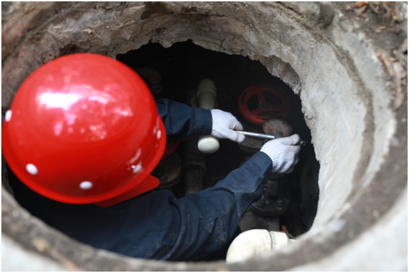 大暑節氣,天氣有些悶熱,最高氣溫超過36度。位于薈萃北區的一棟樓前,運行經營一分公司兩名穿著工作服的檢修人員揭開檢查井蓋進行通風換氣,系緊褲腳、戴好安全帽……做好下井準備工作后,一點一點把身子探進檢查井,工作人員在狹窄的檢查井中對到樓鎖閉閥門進行維護保養。“機油槍遞給我”,狹窄的井口內,李鵬蜷縮其中,抬起掛滿汗水的臉喊道。檢查井深約3米,內部空間狹小,最多能容納2人,在井里作業,隨時會發生磕碰。在有限的作業空間內,檢修員無法伸直手臂,只能依靠腕力打開鎖頭,查看閥門狀態,閥門開關是否老化損壞,管道盤根是否泄漏,接著用機油槍注入機油潤滑并抹油,扭動活動閥門,進行回絲、鎖頭,一步一步對鎖閉閥管道進行保養并清理井室內雜物……