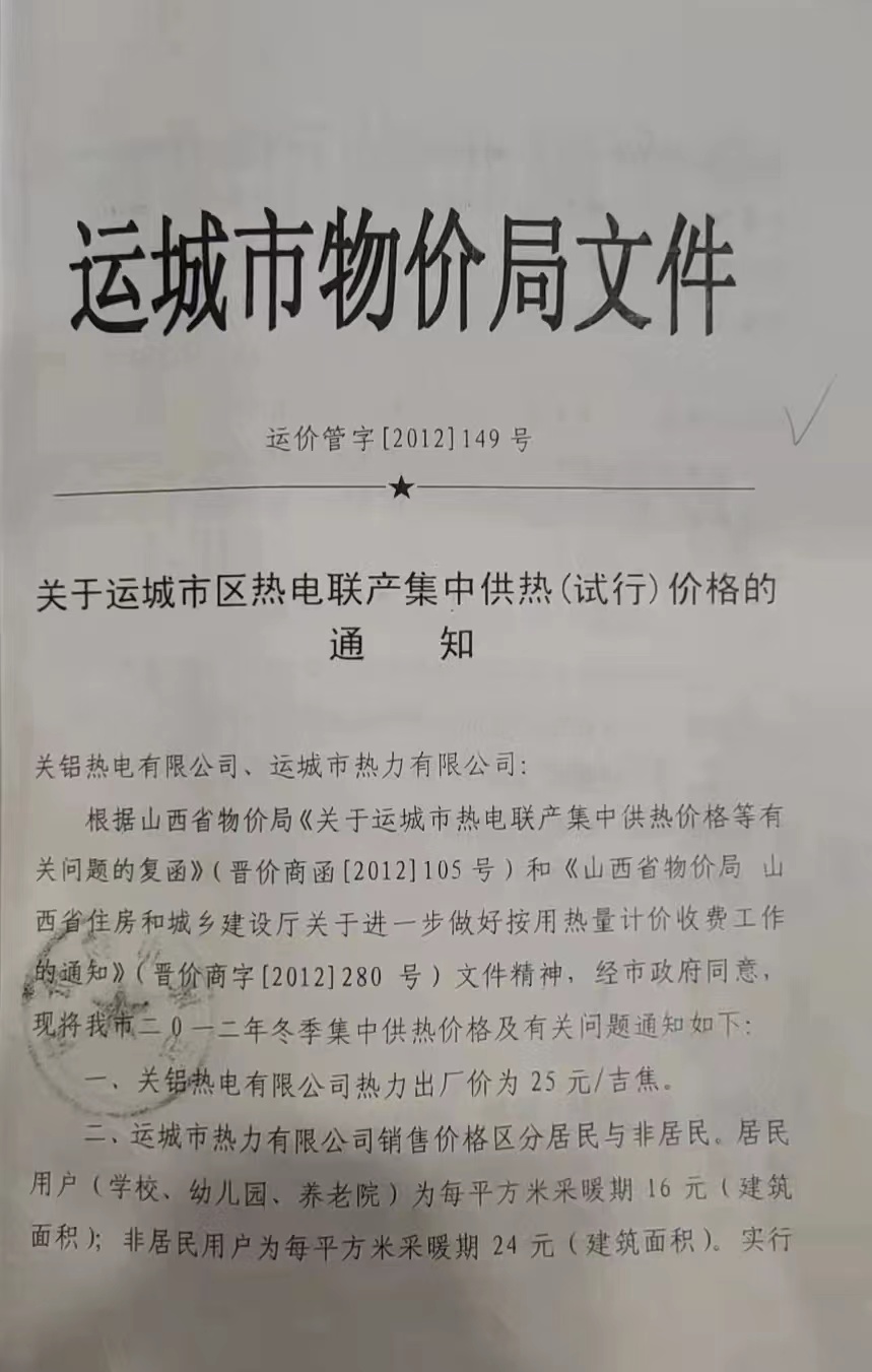 關(guān)于運城市城區(qū)熱電聯(lián)產(chǎn)集中供熱(試行)價格的通知