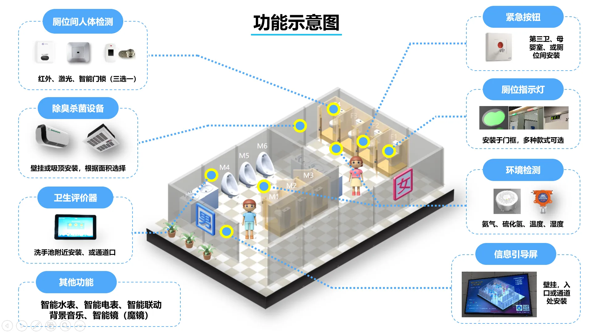 智慧廁所旨在提升公共衛(wèi)生設(shè)施的品質(zhì)和服務(wù)水平,為大眾提供更加便捷、舒適和環(huán)保的廁所體驗(yàn)。如今,隨著科技的不斷進(jìn)步,智慧廁所系統(tǒng)被廣泛采用和建設(shè),其功能和特點(diǎn)也越來越豐富多樣。下面將介紹智慧廁所系統(tǒng)的內(nèi)容。